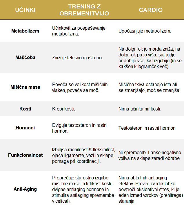 Razlike med cardio in treningom z obrementivijo, ki so jih odkrili strokovnjaki, sem zate povzel v spodnji tabeli…